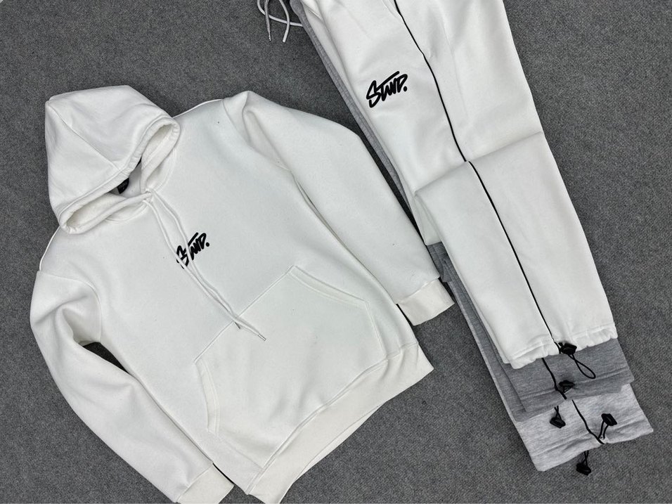 Baggy ayarlanabilir paça alt eşofman.Kırık Beyaz renkte, regular fit kesime sahip, kapüşonlu sweatshirt ve fermuarlı cepli eşofman altından oluşan erkek eşofman takımı. Sokak modası tarzında, yumuşak ve sıcak kumaşlı, sade tasarım.