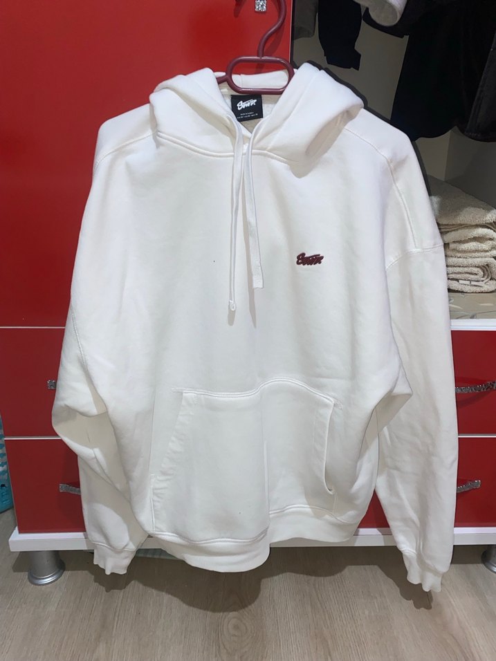 Beyaz renk, kapüşonlu ve uzun kollu unisex sweatshirtü. çok az giyildi hediye gelmişti olmadıgı için satıyorum