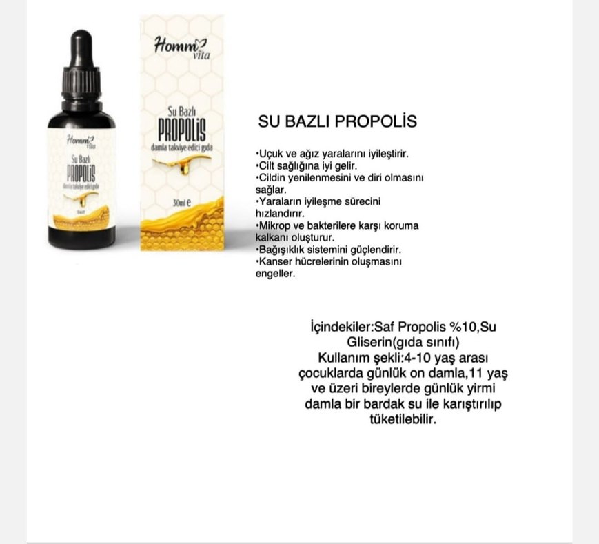 %10 saf propolis içeren su bazlı damla, uçuk ve ağız yaralarını iyileştirir, cilt sağlığını destekler ve yaraların iyileşme sürecini hızlandırır. Mikrop ve bakterilere karşı korur, bağışıklık sistemini güçlendirir, kanser hücrelerinin oluşumunu engeller. 4-10 yaş çocuklarda günlük 10 damla, yetişkinlerde 20 damla su ile karıştırılarak kullanılır.