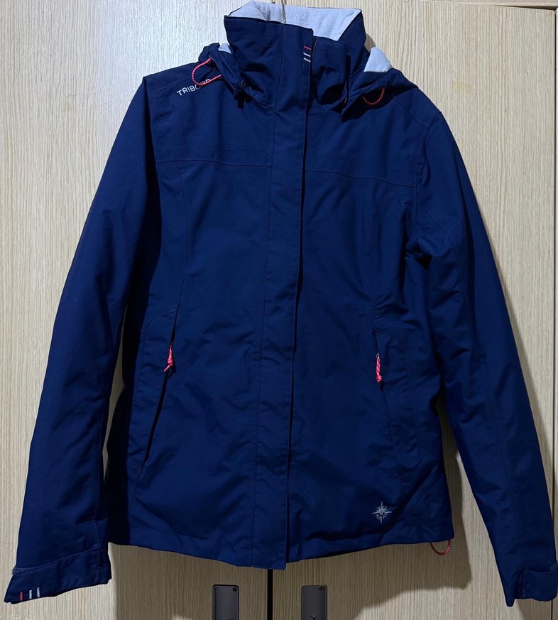 Lacivert renkli, fermuarlı cepleri ve kesik yaka detayı olan, sentetik kumaştan üretilmiş, uzun kollu, midi boy, dar kesim kadın ceket. Decathlon marka kışlık mont