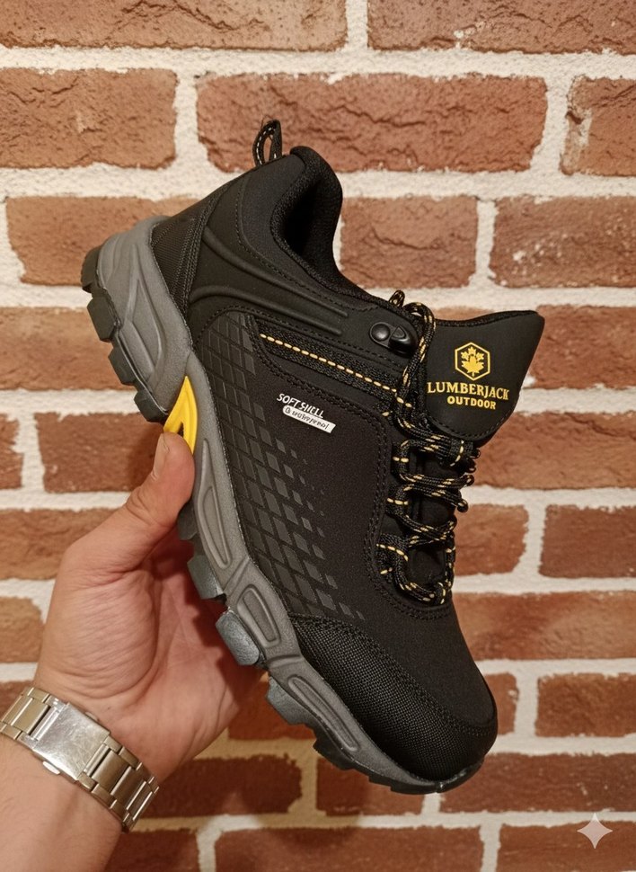 Siyah yılan desenli, bağcıklı erkek outdoor ayakkabısı. Kauçuk tabanlı, sokak stiliyle uyumlu, trend görünümler için ideal.