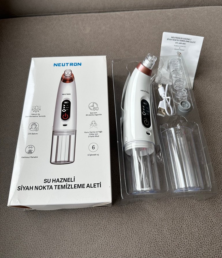 Neutron marka, su hazneli siyah nokta temizleme aleti 6 kademeli emiş gücü ve 3 mod ile gözenek, yağ ve ölü deriyi temizler. Çoklu başlık ve USB kablo içerir.