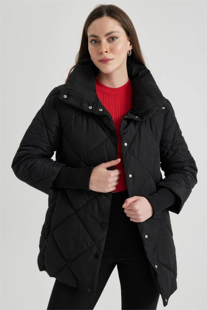 Su İtici Uzun Şişme Mont Dik Yaka Kapitoneli Çıtçıtlı Cepli