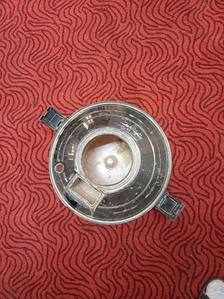 Kırmızı ve gri renklerde, her iki yanında tutma yerleri bulunan çay makinesi parçası. Üzerinde ölçü işaretleri ve küçük bir çıkış noktası vardır.