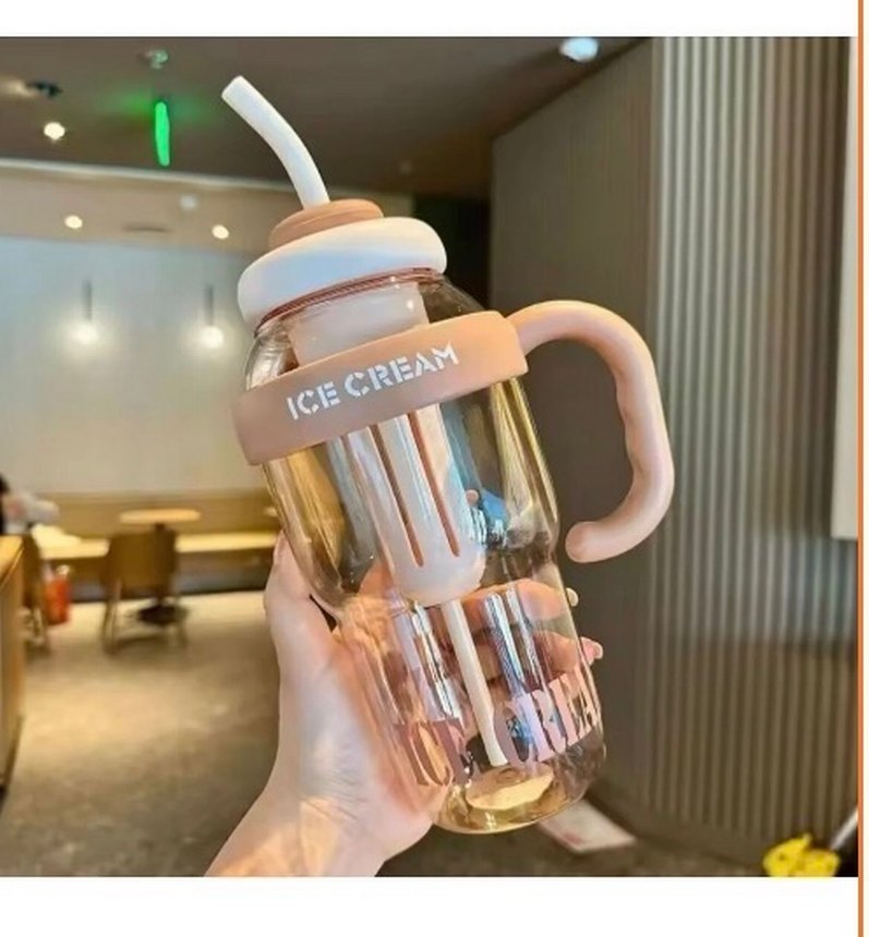 Pastel bej renginde, kulplu ve pipetli #su #matarası #filtreli Üzerinde "ICECREAM" yazısı bulunan şeffaf ve yumuşak tonlarda tasarım. Herhangi bir deformasyon yoktur kullanılmadı #iadeyok