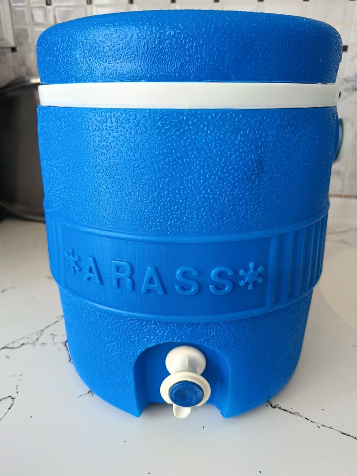 Mavi renkli, dokulu yüzeye sahip çocuk termos şişesi. Beyaz musluğu ile kolay kullanım sağlar. Arass markalı, renkli tasarım.