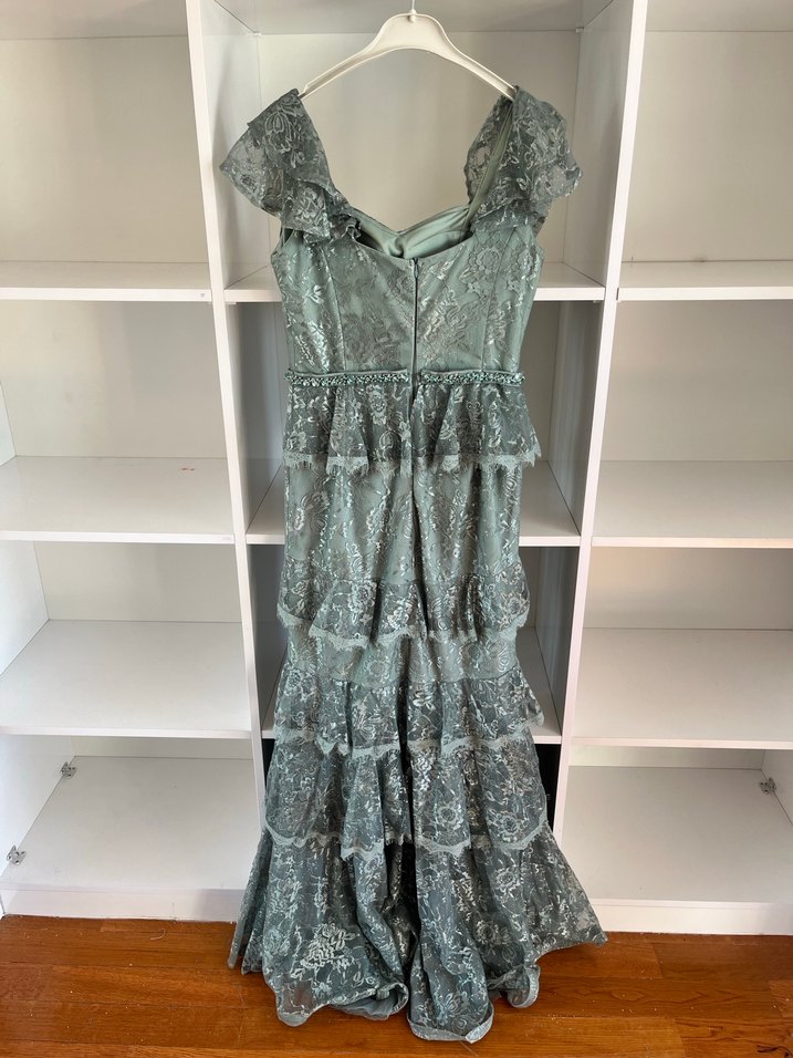 Nakışlı detaylara ve fırfırlara sahip, V yaka ve kolsuz uzun gri abiye elbise. Vintage bohem tarzıyla klasik zarafeti yansıtıyor, düğün için uygun.