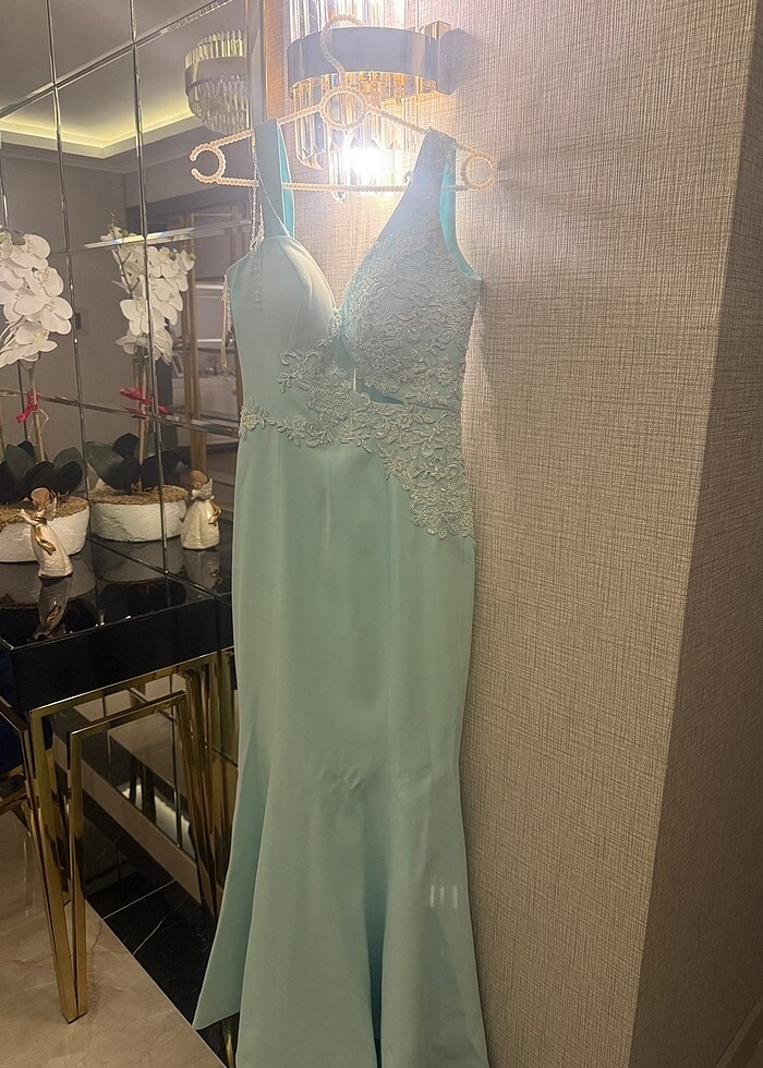 Su yeşili abiye elbise