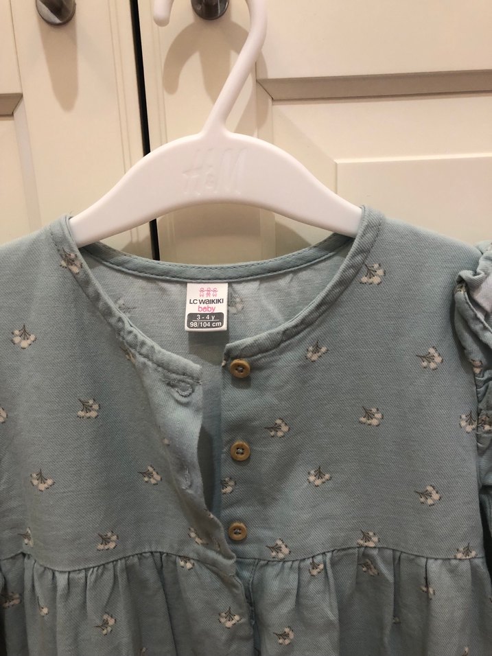 Gei baskılı, pamuklu kumaştan yapılmış, uzun kollu, düğmeli ve yuvarlak yakalı kız elbisesi. Rahat kesimiyle gündelik kullanıma uygundur.