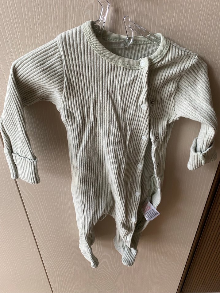 Gri renkli, uzun kollu, örgü dokulu ve yumuşak keten kumaştan yapılmış bebek hastane tulumu. Ön kısmında kolay açılıp kapanan çıtçıtlar bulunur.