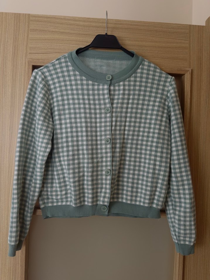 Su yeşili Ekose Desenli Kadın Düğmeli Hırka
