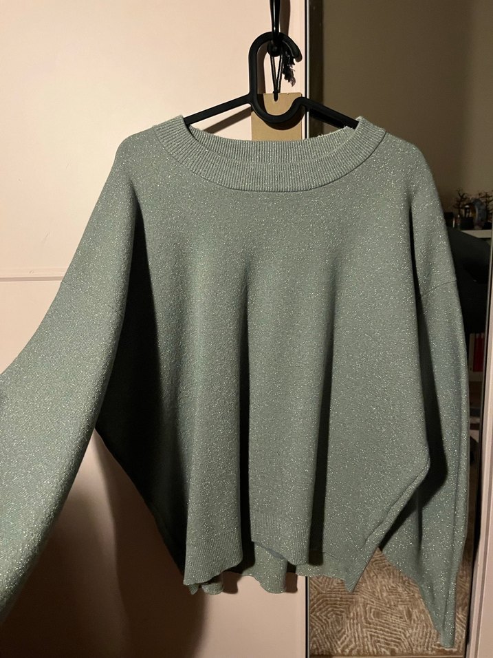Çok beğenerek aldım ama hiç giymedim. Su yeşili/mavimsi, ışıltılı, tok ve kaliteli kumaşı olan bir kazak. Kolları da düz değil detayını fotoğraflara ekledim. Güzel bir parça umarım severek giyecek birisine gider. Ürün small ama M bedenler de çok rahatlıkla giyebilir.