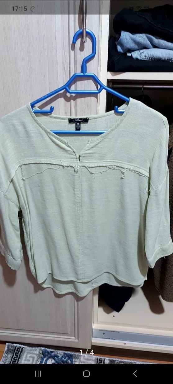 keten kumaştan, V yaka ve kısa kollu, düğmeli, salaş kesim günlük rahat gömlek.