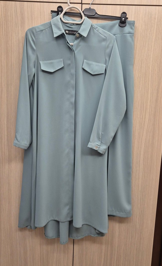 Su yeşili renkte, uzun kollu düğmeli kadın pantolon tunik takım, iki kez giyildi. 36-38 beden. KK design dan alındı.