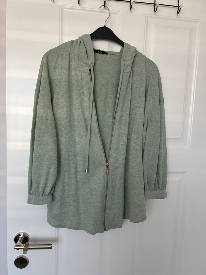 Su yeşili keten , kapüşonlu ve uzun kolludur. Bol kesim, fermuarlı ve midi boydadır, rahat sokak stiline uygundur.