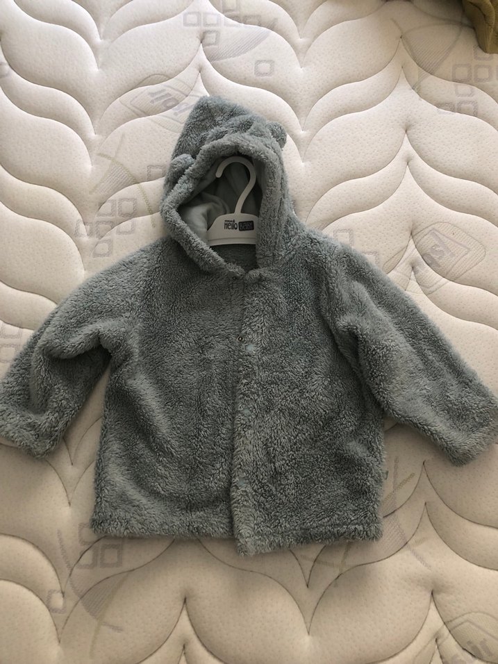 Su yeşili renkli, kapüşonlu ve kürk unisex montu. Bol kesim ve desensiz, yumuşak ve sıcak kumaştan üretilmiştir. Ben 2.5 yaşa kadar giydirdim
