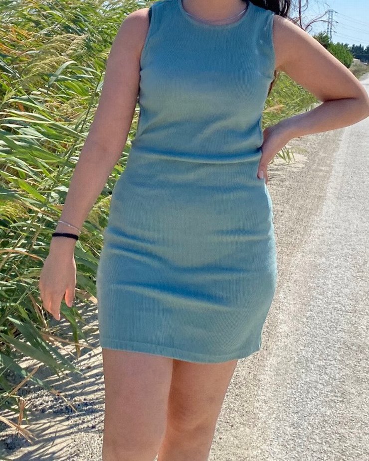 Su yeşili denim kumaştan, kolsuz ve yüksek yakalı, vücuda oturan midi elbise. Pastel tonuyla outdoor rahat sokak stiline uygun. Belinin İki yanında fotoğrafda görüldüğü gibi pencere vardır .
