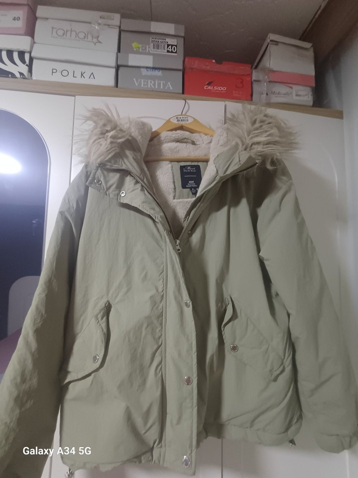 Gri renkte, kürklü kapüşonlu ve bol kesim kadın ceketi. Uzun kollu, çıtçıtlı cep detaylı, midi boyda, rahat ve sıcak kumaştan üretilmiştir.
