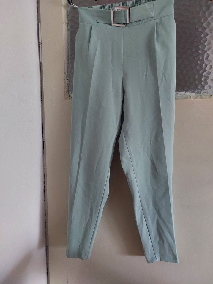 su yeşili renkte, midi boy, kemerli kadın pantolonu. Sentetik kumaştan yapılmış, rahat ve günlük kullanıma uygun.