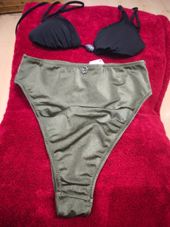 Kadınlar için siyah askılı üst ve şu yeşili yüksek bel alt parçalı, kısa ve sade tasarımlı bikini. Plaj ve spor tarzı için rahat ve şık görünüme sahiptir. ️