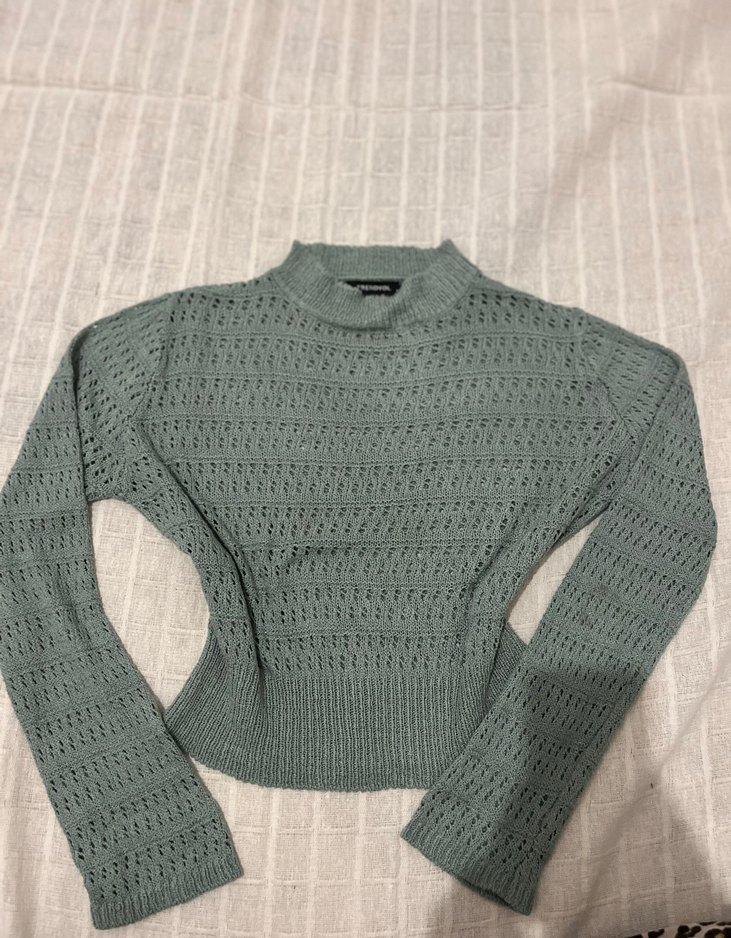 Su yeşili renkli, uzun kollu ve bisiklet yaka olan bu örgü kazak, günlük kullanıma uygun rahat ve şık bir görünüm sunar. Normal midi boyda ve dokulu desensiz yapıya sahiptir.