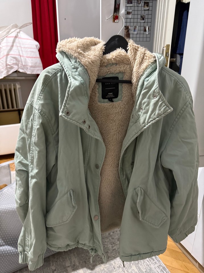 Bol kesim, gri midi ceket, peluş detaylı astar ve kesikli yaka ile. Yumuşak, rahat kumaştan, günlük sokak stili için uygun. Uzun kollu ve desensiz. S m ve l uyumlu şapkasının peluşu takılıp cıkabilir