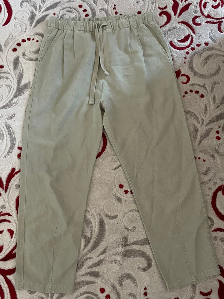 Açık su yeşili renkli keten, rahat kesim kadın pantolon. Lastikli bel ve bağcık detaylı, günlük kullanıma uygun şık ve rahat bir model. Zara marka. S beden.