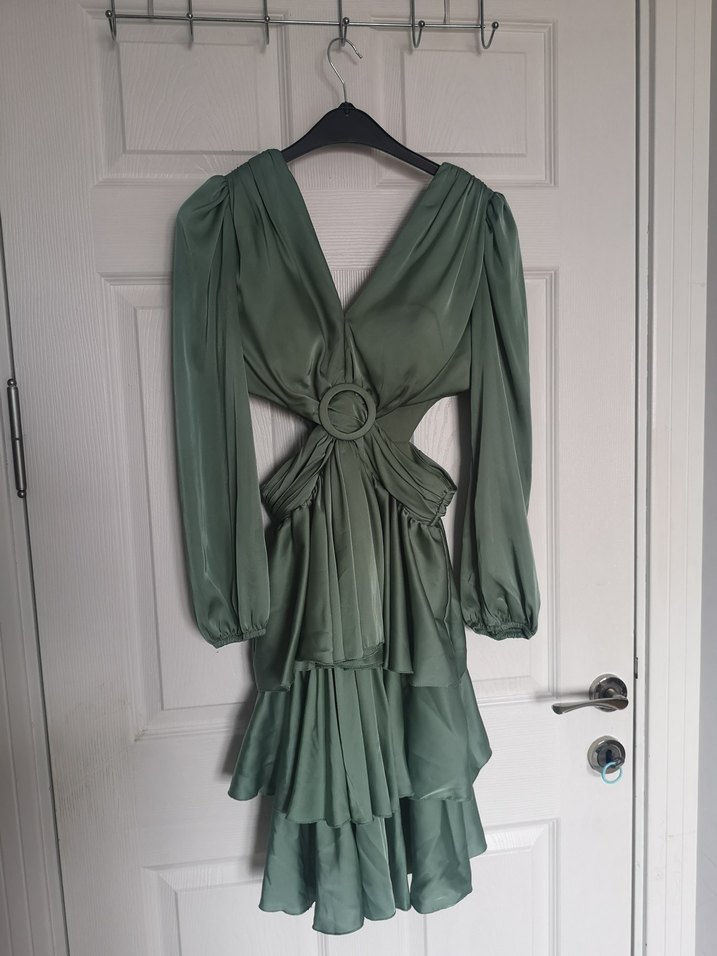 Su yeşili, v yaka(yakasını açık olduğu için çok az diktirmiştim) ve uzun kollu dar kesim elbise, kemerli ve yanları açık detaylara sahiptir. Parlak kumaşı ve kat kat etekleriyle bohem tarzda romantik akşamlar için uygundur. NOT:Mezuniyette taktığım çantadan dolayı sağ omzunda azcık ipliklenme oldu.Son fotoğrafta bulunmakta.