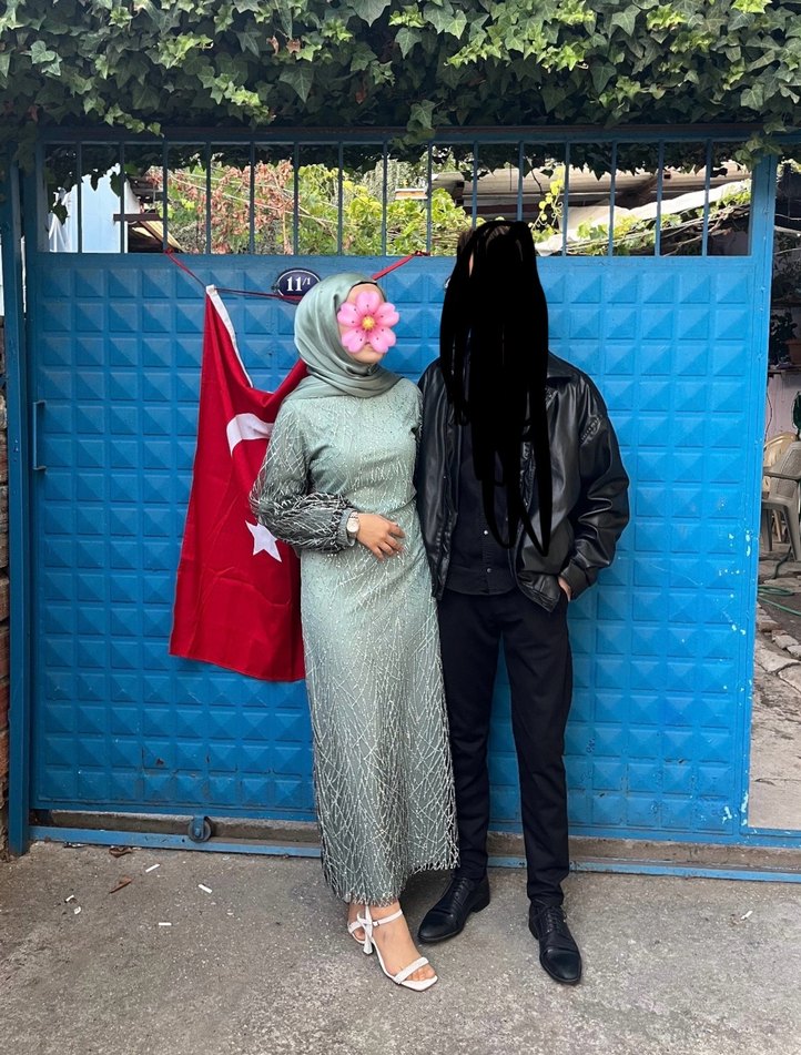 Su yeşili renkli, uzun kollu ve yüksek yakalı bu abiye elbise etnik desenlere ve drapeli detaylara sahip, tesettürlü bir modeldir şalıyla beraber satılıyor 40 bedendir ama belden çok az daralttırılmıştır bi kere giyilmiştir sadece