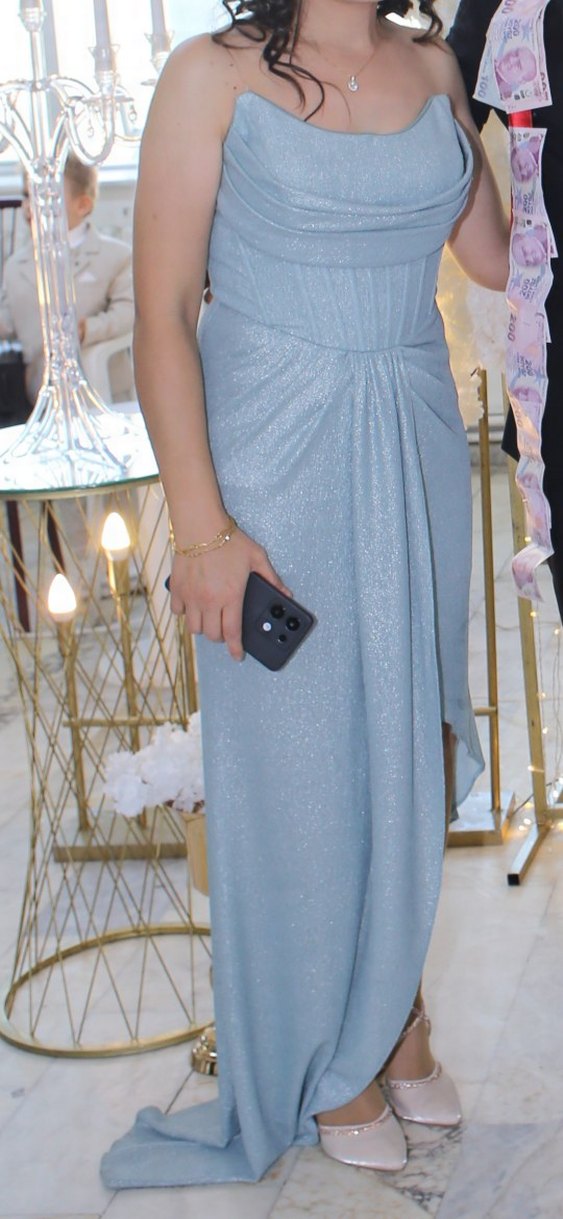 su yeşili renginde straplez kuyruklu simli abiye elbise 1 kez giyildi. hiçbir sorunu yok.