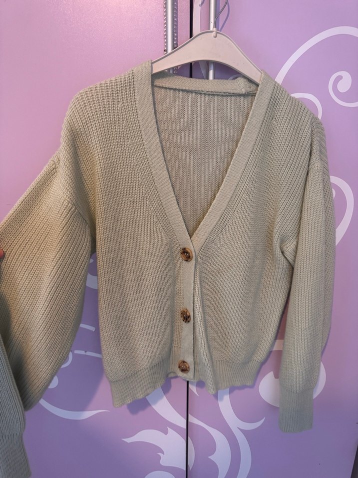 Su yeşili renkte, V yakalı, uzun kollu, normal boyda, bol kesim triko kadın hırka. Hiç giyilmedi Standart beden çok tatlı bir butikten aldım rengi su yeşili Xl kadar olur diye düşünüyorum zaten bedeni standart kol datayı çok güzel bol salaş evde de dışarıda da giyilecek bir ürün