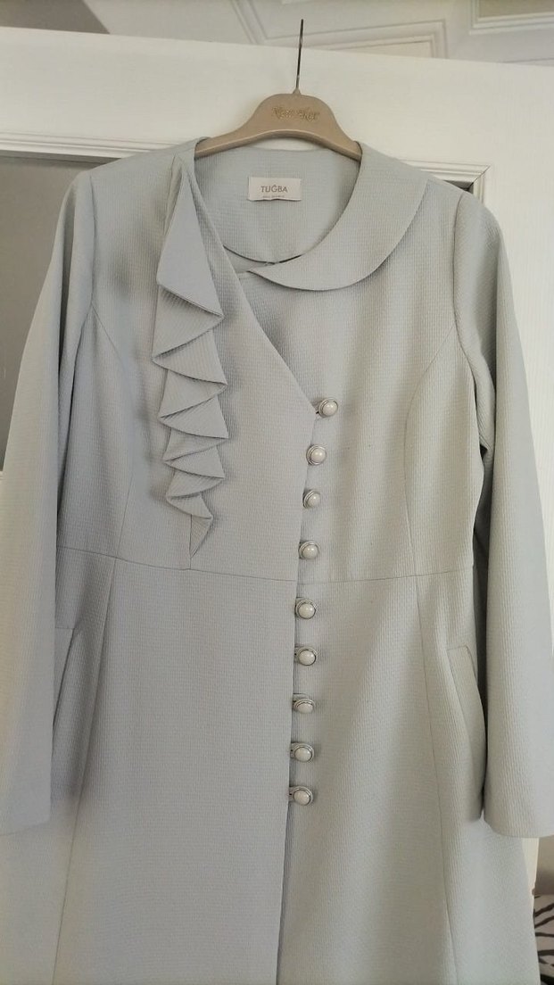Bej renkte, düğmeli uzun hamile kabanı. Keten kumaştan, klasik ve normcore tarzda, ofis için uygun, regular fit ve uzun kollu.