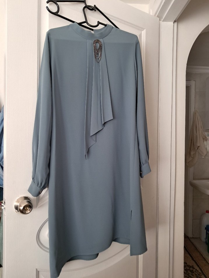 yesil renkte, uzun kollu ve yüksek yakalı drapeli tunik. Rahat kesimli, ipeksi kumaştan, modern klasik tarzda duyun nisan özel gunler kullanımı için uygundur.