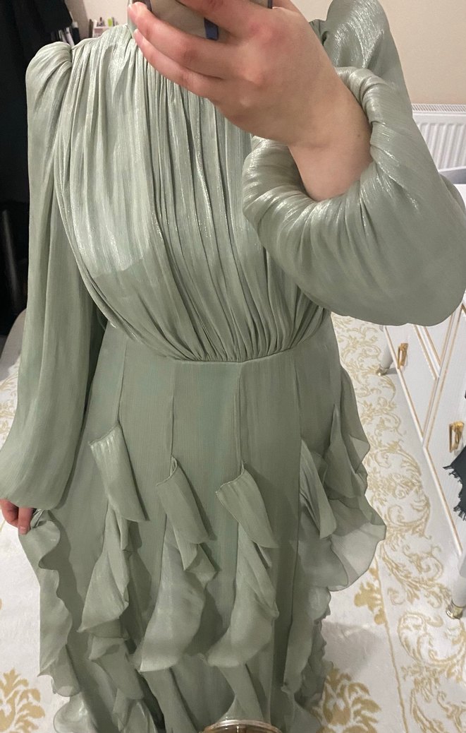 38-40 beden hiç giyilmedi Su yeşili , V yaka ve uzun kollu, bol kesim uzun gece elbisesi. Fırfır detaylarıyla bohem ve avangart tarzda, düğün için uygun.