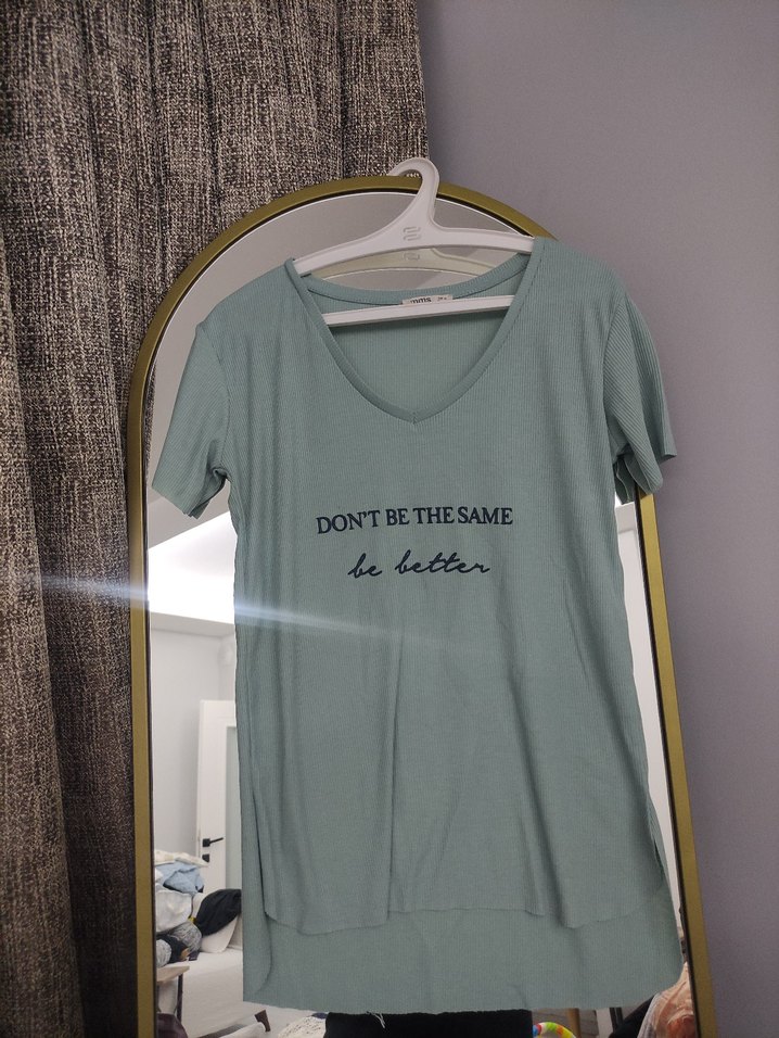 Su Yeşili pamuklu kumaştan, V yakalı ve kısa kollu, rahat kadın tişörtü. Üzerinde motivasyonel baskı bulunur. Ölçüleri ekli sorunu yok hiç kullanılmadı