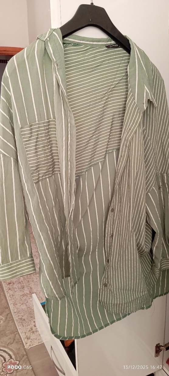 şu yeşili renkli keten kumaştan, uzun kollu ve düğmeli önü olan bol kesim gömlek. Çizgili deseni ve yakası notlu, midi boy, günlük rahat stil için uygun.