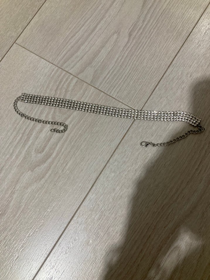 Gri renkli, zincir detaylı kadın vücut zinciri. Minimalist rock punk tarzında, günlük kullanıma uygun.