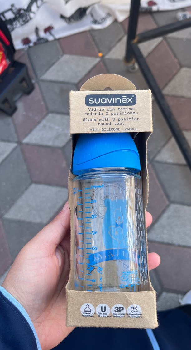 Suavinex cam biberon, 3 pozisyonlu yuvarlak silikon emzik ile 240 ml kapasiteye sahiptir. Mavi kapaklıdır.