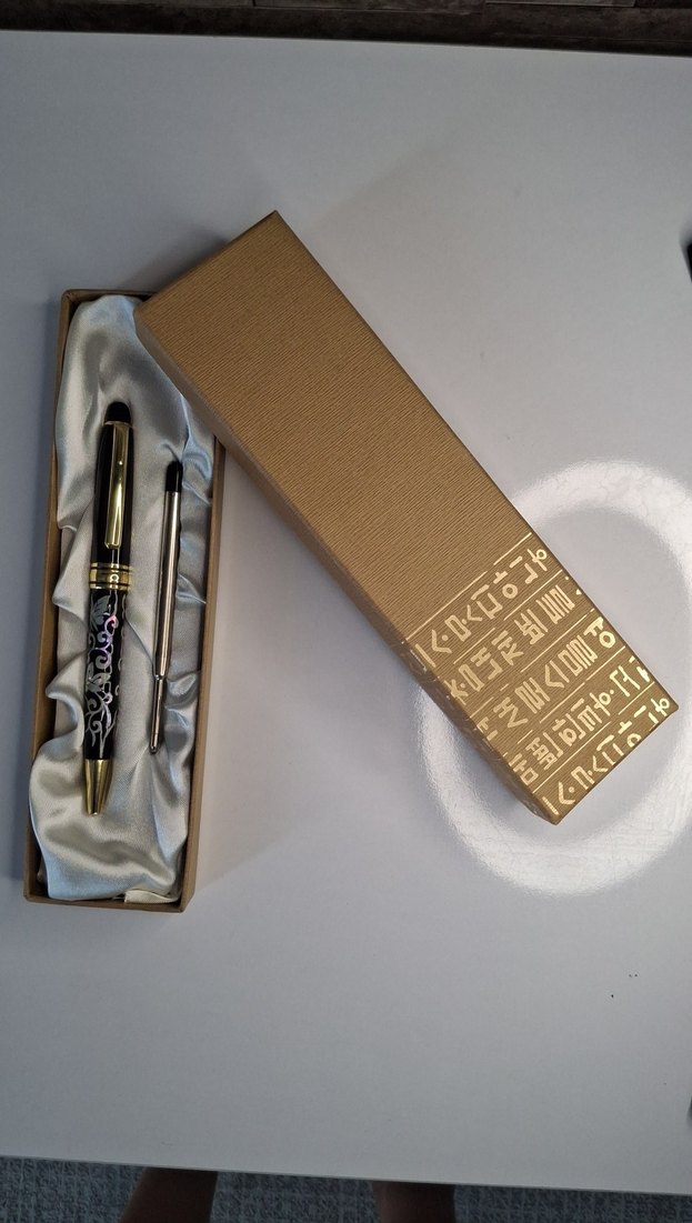 Altın detaylı koyu renkli dolma kalem, saten astarlı dokulu altın hediye kutusunda. İçinde yedek kartuş bulunur. ✒️