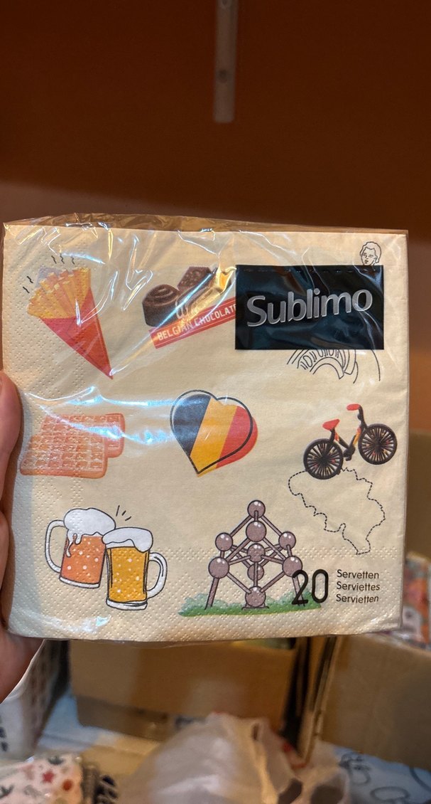 Sublimo markalı, bira bardakları, waffle, bisiklet ve Belçika temalı renkli baskılara sahip açık kahverengi 20'li parti peçetesi.