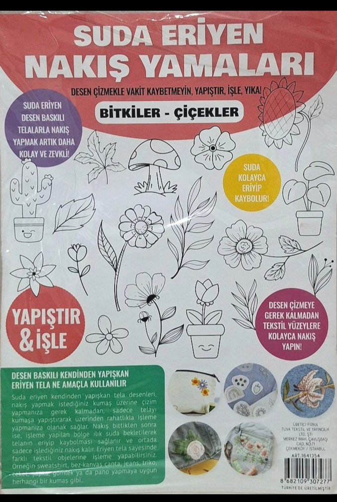Bitki ve çiçek desenli, suda eriyen nakış yamaları. Çizmeden yapışır, suyla kolayca çözünür, nakış yapmayı kolaylaştırır.