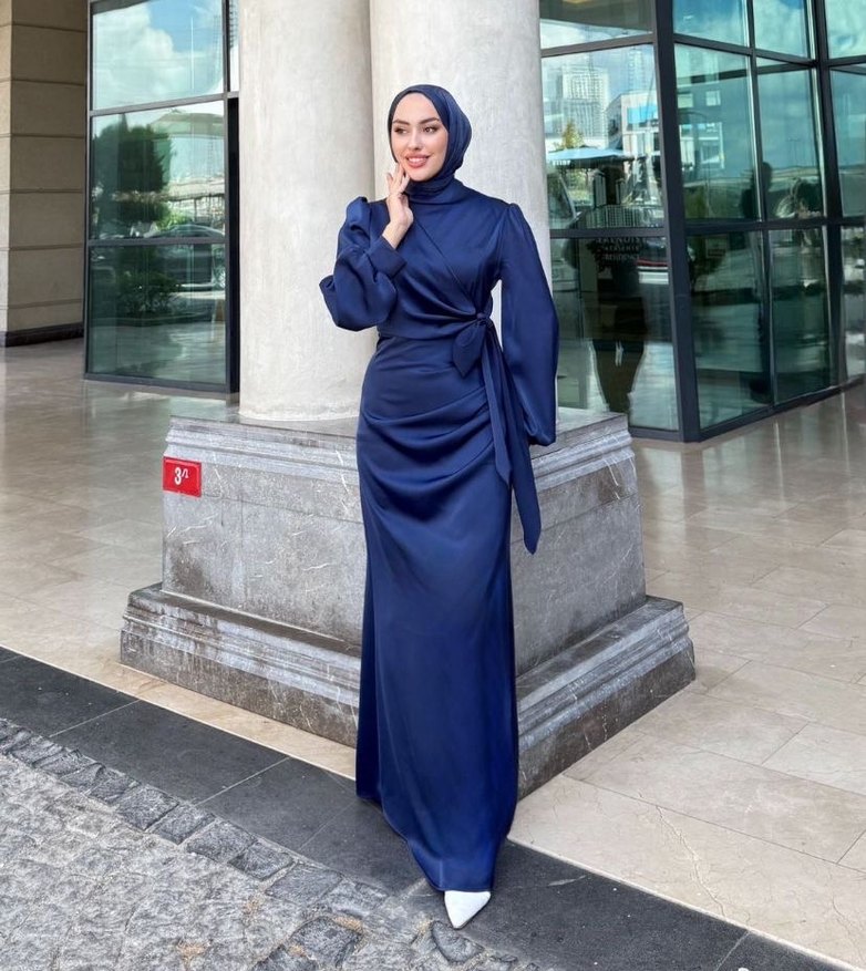 Lacivert renkte, yüksek yakalı ve uzun kollu drapeli abiye elbise. Düzenli kesimi ve parlak dokusuyla düğünler için uygun, mütevazı ve gösterişli.