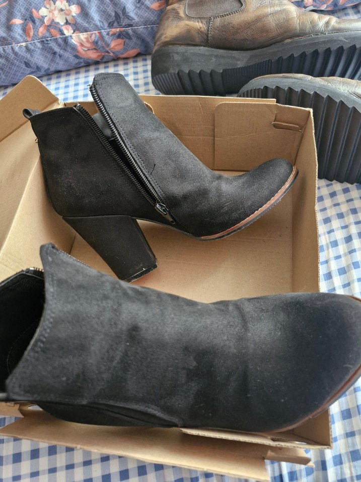 Siyah süet deri kadın botlar, kalın topuklu ve tokalı detaylara sahip. Trendy rahat sokak stili ve günlük kullanım için uygundur. Rahat ve desensiz tasarım...Yeni Durumda 2 ,3 kez giyilmiştir..Diğer İlânlarıma Bakınız..