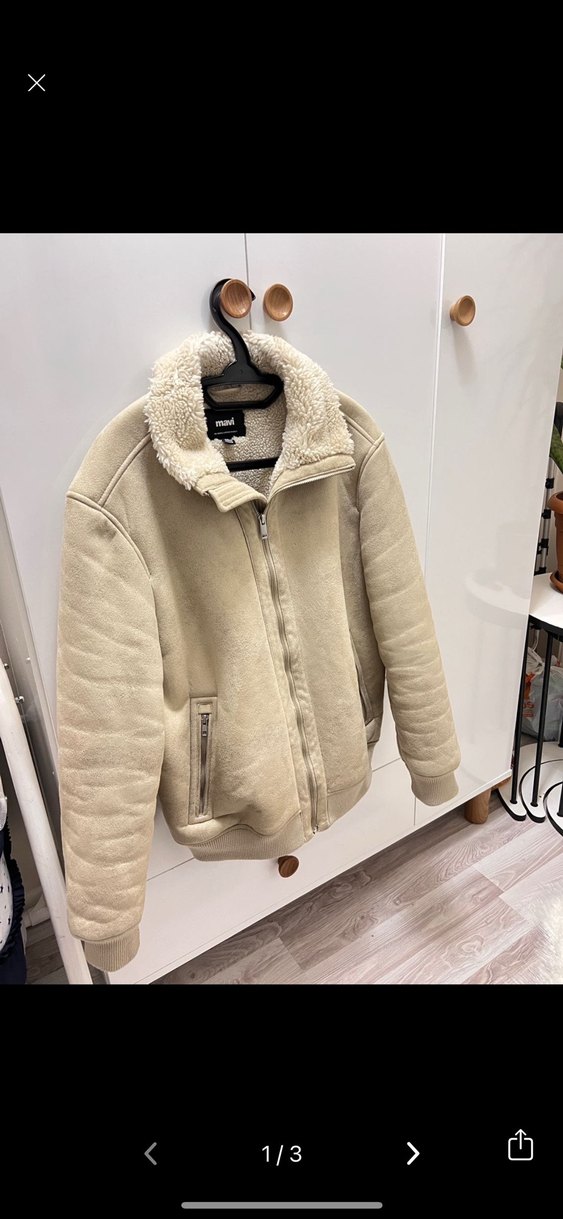 Süet kumaştan, kürk detaylı yakalı ve uzun kollu bej kışlık kadın ceketi. Orta boy, sade ve rahat sokak stili için uygun.