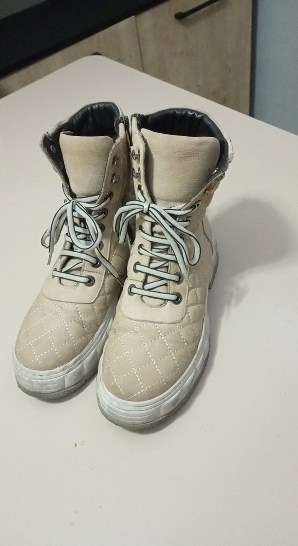 Bej süet kadına özel, dolgu topuklu ve bağcıklı, bej tonlu sokak stili botlar, kapitone desenlidir.
