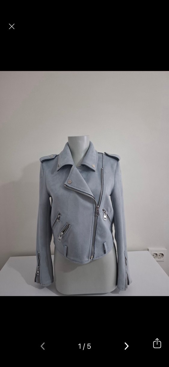 Gri süet biker ceket, çıtçıtlı yaka, fermuarlı cepler ve regular fit ile kısa boyda. Askılı kollu, günlük kullanıma uygun şık bir model. Göğüs 44 boy 49 cm