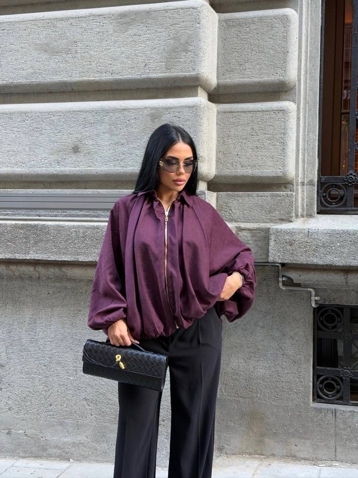 Bu bol kesim kadın bomber ceket, süet kumaş, yüksek yakalı ve uzun kolludur. Dökümlü tasarıma ve normal midi uzunluğa sahiptir. S/M/L beden aralığı 4 renk seçeneği