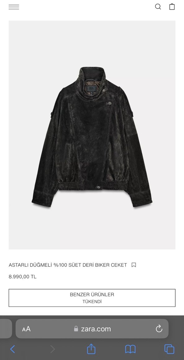 zara süet deri biker ceket, % 100 süet deriden yapilmis ana kumaga sahip biker tarzi ceket. Dik yaka ve omuzda askili uzun kollu. Önde biyeli cepler. Etek ucu elastik. Ton sür ton iç astar. Patlet ve astarli dügmelerle gizlenmis metal fermuarli kruvaze ön kapama.