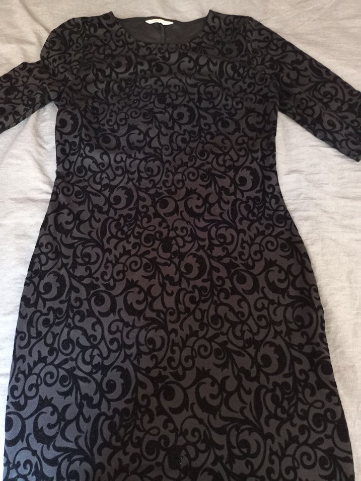 süet detaylı, uzun kollu siyah gotik desenli, klasik ve şık ofis elbisesi.