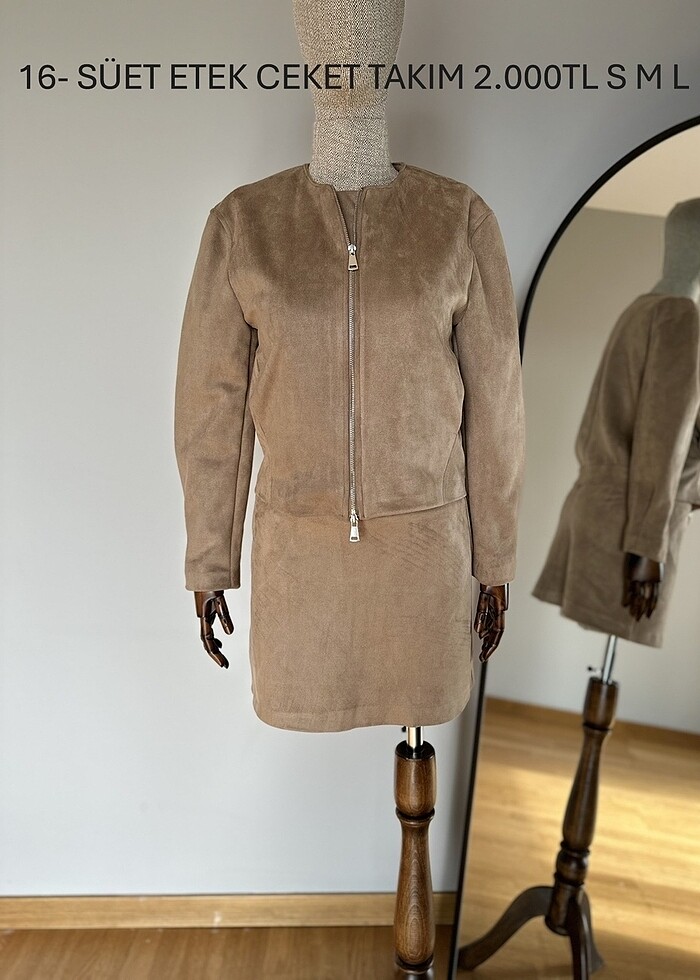 Süet Etek Ceket Takım Sütlü Kahve Renk. Şuan 4 adet S, 3 adet M, 2 L bedenleri mevcuttur. Etiketli, kullanılmamış. İş değişikliğinden dolayı elimizdeki ürünleri uyguna satıyoruz. İade ve Değişim yapamıyoruz, anlayışınız için teşekkürler. Mağazalar ve satıcılar diğer kadın giyim tekstil ürünlerimize lütfen bakınız, toptan alınacaksa uygun fiyata bırakacağız. Teşekkürler.